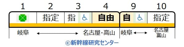・9号車:10・11A(対応座席)、10・11D席(移乗席あり)