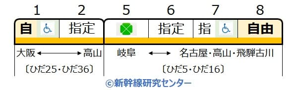 大阪~岐阜間は1・2号車の2両、名古屋~岐阜間は5~8号車の4両で、岐阜駅で切り離し・併結を行い岐阜~高山・飛騨古川間は6両で運転します。