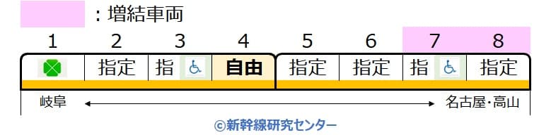 増結しない場合の編成は、「6両編成(基本編成)③|1・8号車が自由席」をご覧ください。