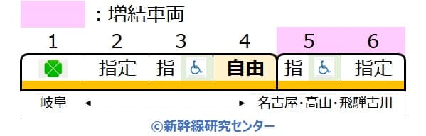 増結しない場合の編成は、「6両編成(基本編成)①|4号車が自由席」をご覧ください。