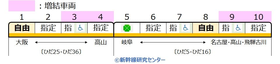 大阪~岐阜間は1~4号車の4両、名古屋~岐阜間は5~10号車の6両で、岐阜駅で切り離し・併結を行い岐阜~高山・飛騨古川間は10両で運転します。