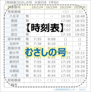 武蔵浦和駅より西側の武蔵野線沿線から大宮駅に直通する『むさしの号』の最新版時刻表を調べることができます。