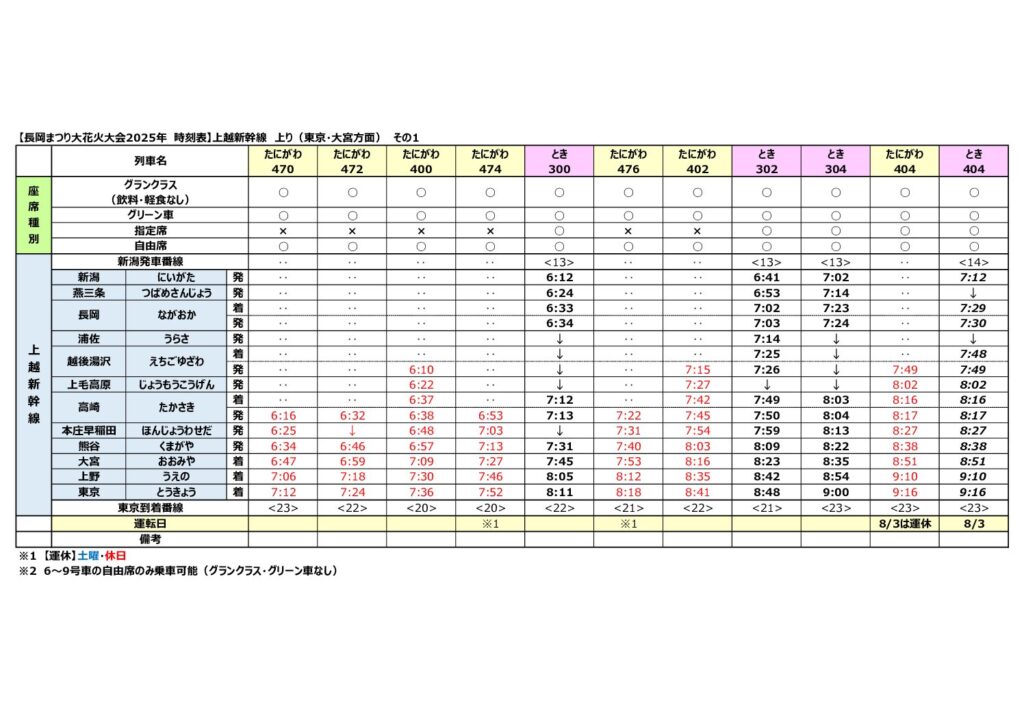 2025年8月2日(土)・3日(日)に新潟県長岡市で開催される『長岡まつり大花火大会』にあわせて運転される、上越新幹線の全駅・全列車時刻表です。