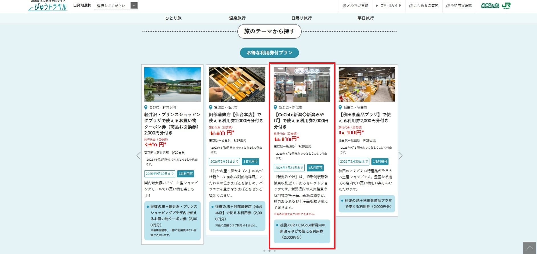 東京と新潟までの日帰り旅行で新幹線を40%OFFで乗れる方法は、「びゅうトラベルの日帰りプラン」の『【CoCoLo新潟◇新潟みやげ】で使える利用券2,000円分付き』を利用するのが一番お得です!